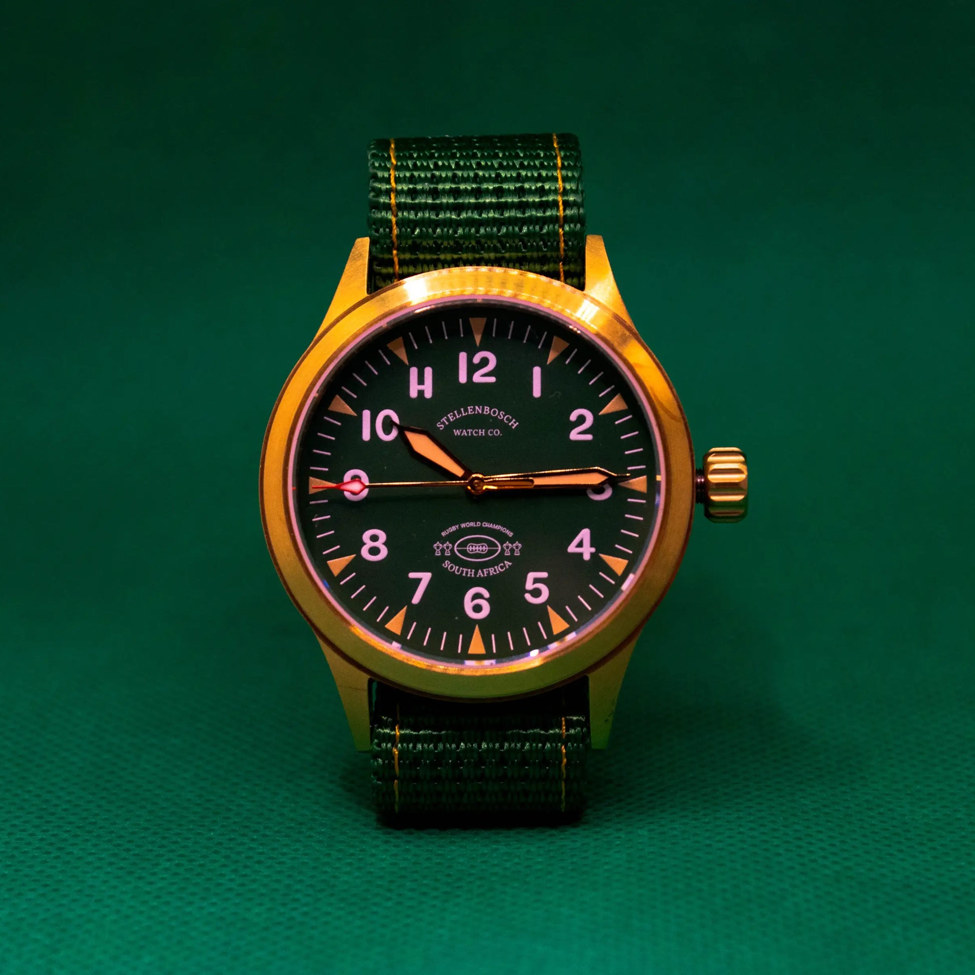 A timeless masterpiece commemorating South Africa's rugby triumph. The gold-tone case exude elegance and sophistication, mirroring the South African rugby teams' golden era. The green dial, adorned with classic numerals and hands, evokes the spirit of the South African rugby teams' home turf.